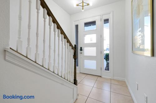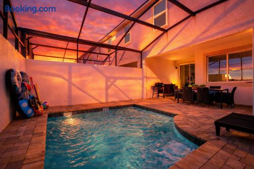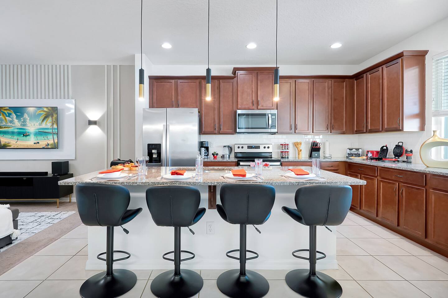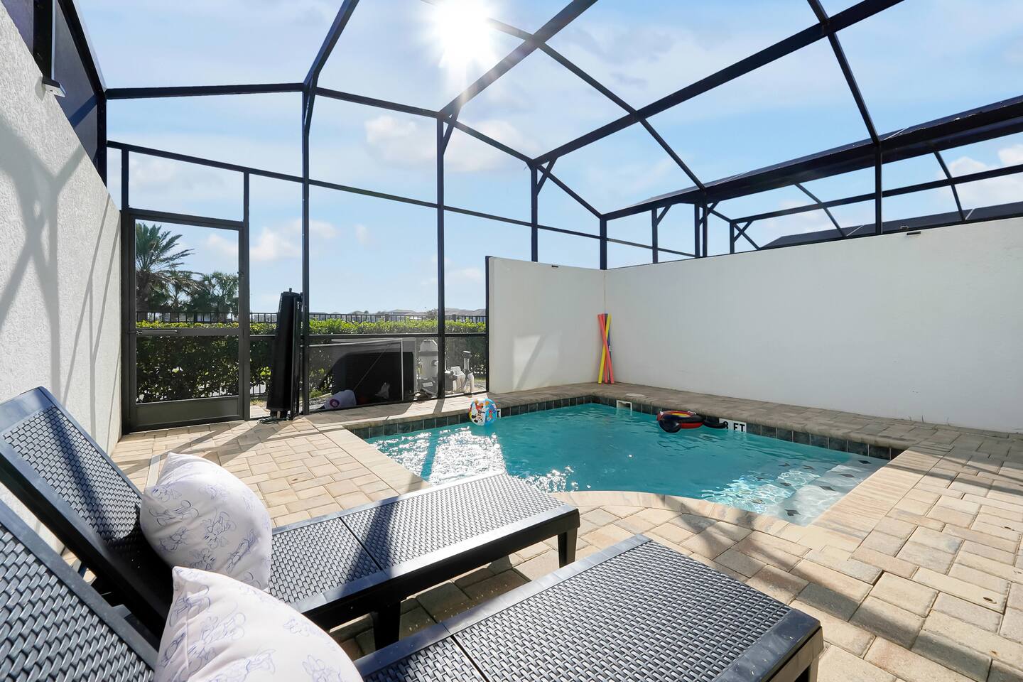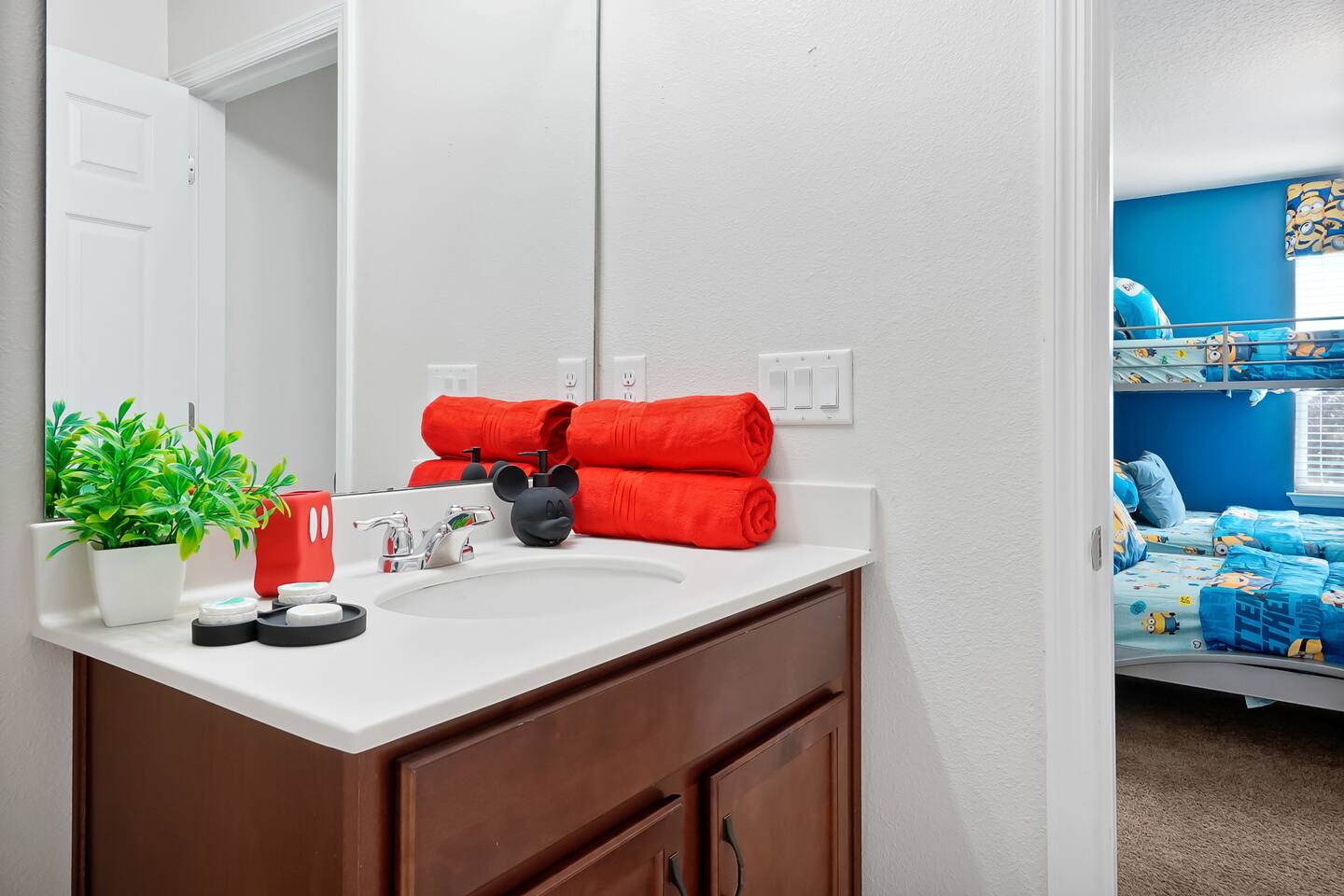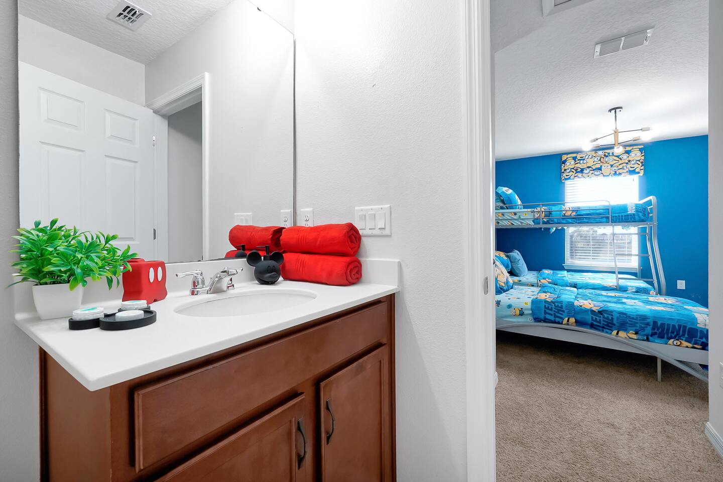 This well-equipped home is designed for a comfortable and easy stay, whether youโre visiting for theme parks or a longer getaway. Central air conditioning keeps the home cool year-round, and a full washer and dryer are available for guest use. Fresh towels and linens are provided for your stay (washcloths are not included), along with practical essentials like hair dryers, an iron, and an ironing board. The family room features a large flat-screen TV and opens to the outdoor area with patio furniture and sun loungers. Guests enjoy self check-in with a private door code assigned for each stay, making arrival simple and flexible. FIRST FLOOR โข Bedroom 1: King bed โข Full bathroom next to the bedroom โข Half bath located near the pool area SECOND FLOOR โข Bedroom 2: King bed with private bathroom โข Bedroom 3: Bunk bed (twin over full) with a sliding twin bed โข Bedroom 4: Bunk bed (twin over full) plus a separate twin bed, with private bathroom โข Loft area with pull-out sleeper sofa โข Full hallway bathroom USEFUL INFORMATION โข Check-in: After 4:00 PM โข Check-out: Before 10:00 AM โข Parking: Free on-site parking, up to 6 cars per home โข Street parking is not permitted โข No commercial vehicles, RVs, trailers, buses, golf carts, or watercraft allowed This home is self-catering. A small welcome kit is provided to get you started, and a nearby supermarket is available for additional supplies. Pool heating: Pool heating operates via heat exchange and may not function effectively in cold weather. Safety systems may cause the heater to cycle off temporarily in colder conditions.