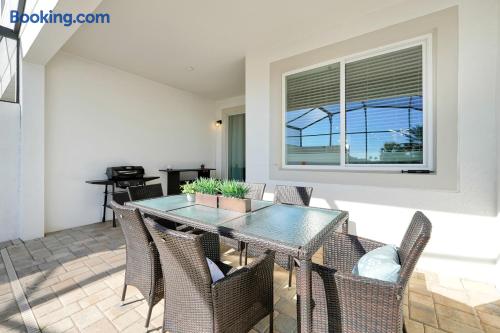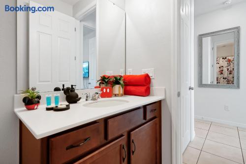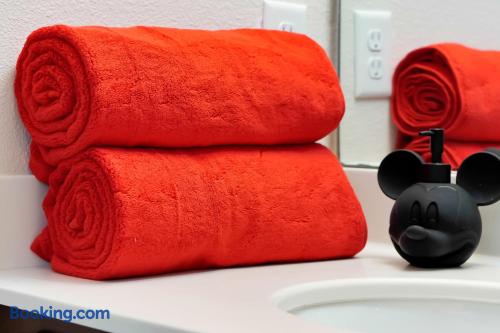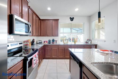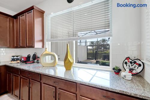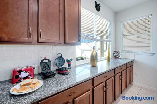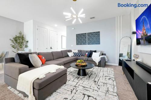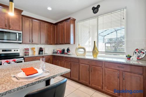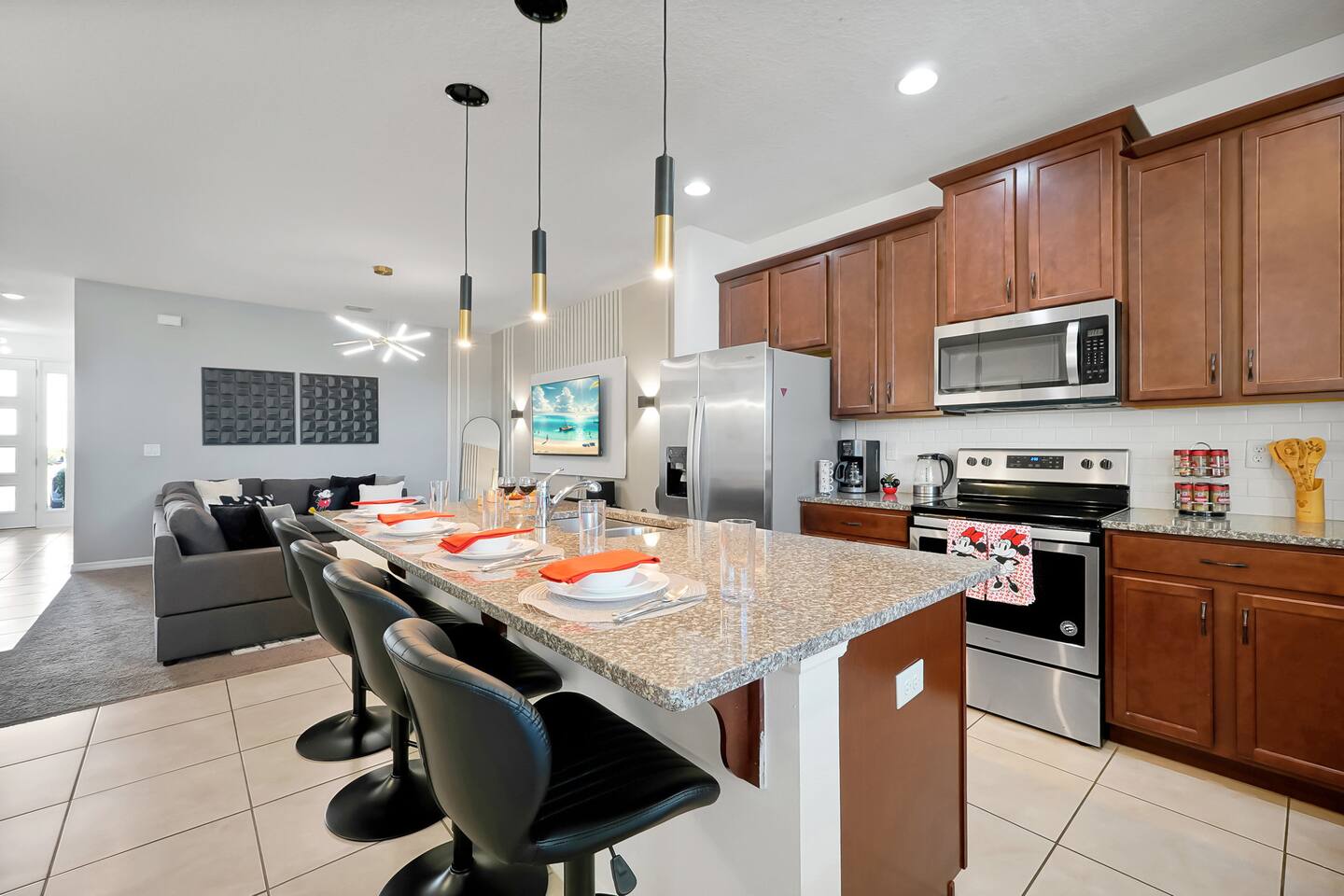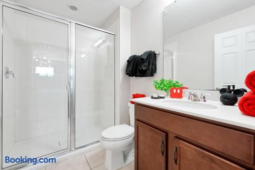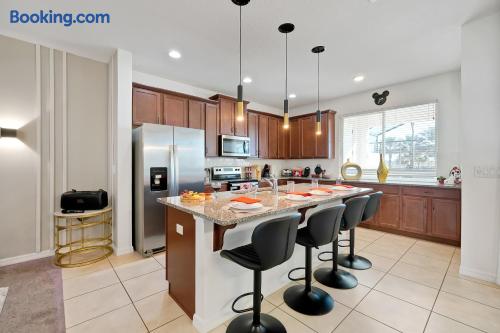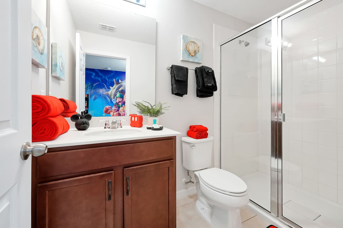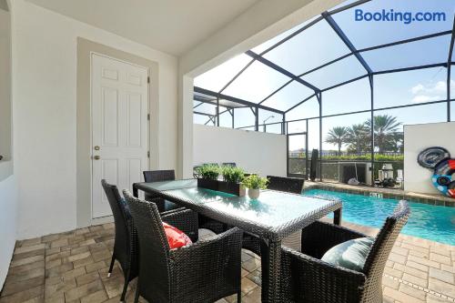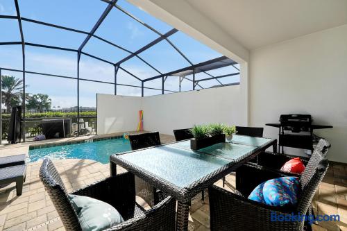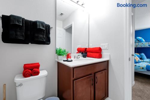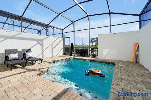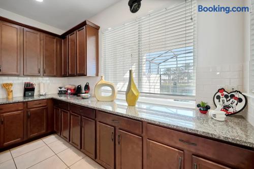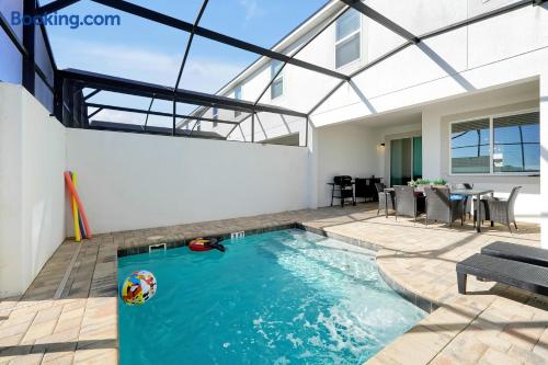 This well-equipped home is designed for a comfortable and easy stay, whether youโre visiting for theme parks or a longer getaway. Central air conditioning keeps the home cool year-round, and a full washer and dryer are available for guest use. Fresh towels and linens are provided for your stay (washcloths are not included), along with practical essentials like hair dryers, an iron, and an ironing board. The family room features a large flat-screen TV and opens to the outdoor area with patio furniture and sun loungers. Guests enjoy self check-in with a private door code assigned for each stay, making arrival simple and flexible. FIRST FLOOR โข Bedroom 1: King bed โข Full bathroom next to the bedroom โข Half bath located near the pool area SECOND FLOOR โข Bedroom 2: King bed with private bathroom โข Bedroom 3: Bunk bed (twin over full) with a sliding twin bed โข Bedroom 4: Bunk bed (twin over full) plus a separate twin bed, with private bathroom โข Loft area with pull-out sleeper sofa โข Full hallway bathroom USEFUL INFORMATION โข Check-in: After 4:00 PM โข Check-out: Before 10:00 AM โข Parking: Free on-site parking, up to 6 cars per home โข Street parking is not permitted โข No commercial vehicles, RVs, trailers, buses, golf carts, or watercraft allowed This home is self-catering. A small welcome kit is provided to get you started, and a nearby supermarket is available for additional supplies. Pool heating: Pool heating operates via heat exchange and may not function effectively in cold weather. Safety systems may cause the heater to cycle off temporarily in colder conditions.