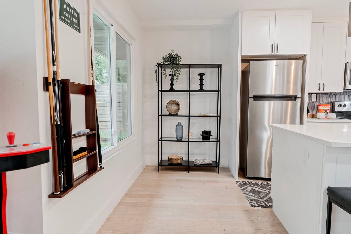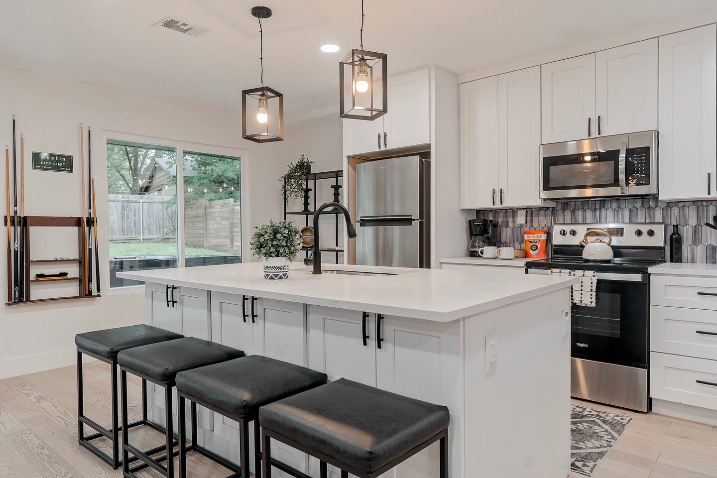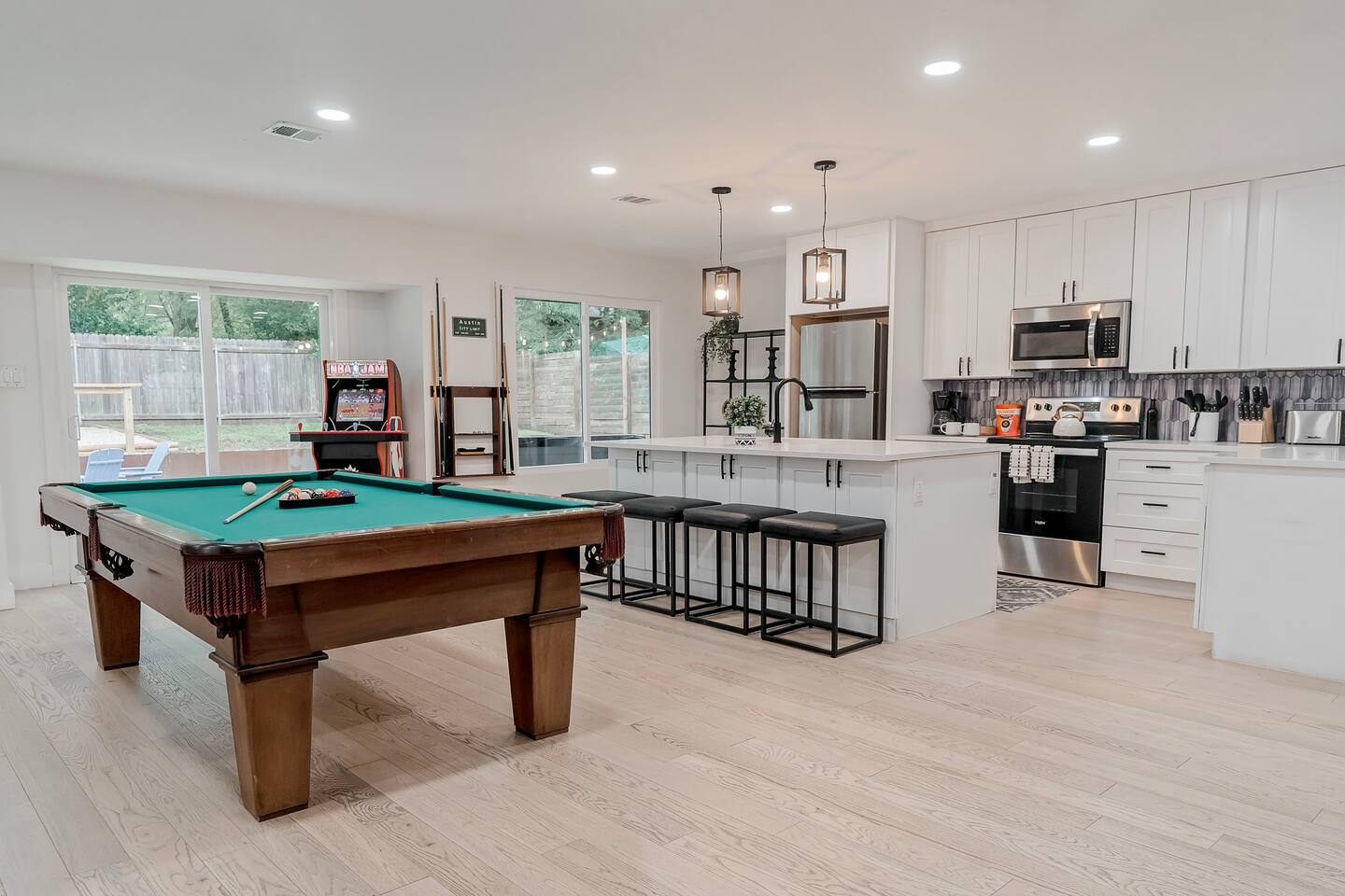 KEY FEATURES ☀ 4 inviting bedrooms; plush beds for up to 10 guests ☀ 3 full bathrooms ☀ Fully equipped kitchen & cooking essentials ☀ Open-concept living room with Smart TV, board games & fast Wi-Fi ☀ Dedicated workspace for remote work or study ☀ Private backyard oasis: 8-person hot tub, gas BBQ, dining set, fire-pit & lawn ☀ Game zone with full-size pool table ☀ Private driveway parking & keyless entry ☀ Pet-friendly, exterior security cameras for peace of mind ☀ A/C, heating, washer & dryer for year-round comfort ☀ Security Cameras ☀ We provide a baby crib (listed as a "cot" on Airbnb for U.S. guests) ☆☆ KITCHEN + LOUNGE ☆☆ The gourmet kitchen comes loaded with stainless-steel appliances, dishwasher, microwave, large fridge/freezer, and cookware. ☆☆ OUTDOOR SPACE ☆☆ Step into your private backyard oasis: Relax in the hot tub under sparkling café lights. Fire up the BBQ grill and enjoy dinner on the outdoor. Gather around the fire-pit for cozy evenings with friends and family. Challenge your group with a game of pool. Spacious lawn for pets or kids to run and play. This outdoor space is designed for both relaxation and fun — whether it's a morning coffee or a late-night soak in the hot tub. ☆☆ NEIGHBORHOOD & NEARBY ATTRACTIONS ☆☆ Located in East Austin, you’ll be close to everything that makes the city vibrant: Mueller Lake Park (5 min drive): perfect for morning walks, jogging, or family picnics. Downtown Austin (15 min drive): live music, nightlife, and cultural hotspots. Austin-Bergstrom Airport (20 min drive) for easy travel connections. ☕ Local eats & coffee: Hank’s, Paco’s Tacos, Batch Craft Beer & Kolaches. 🍺 Breweries & nightlife: Austin Eastciders, Zilker Brewing, and other East Side gems. 🛍️ Shopping: Mueller Market District & farmers market. 🎶 Live Music: Iconic East Austin venues just minutes away. ☆☆ HOSPITALS & ESSENTIALS NEARBY ☆☆ Dell Children’s Medical Center – 10 min St. David’s Medical Center – 12 min Grocery stores like HEB and Whole Foods Market within a short drive.