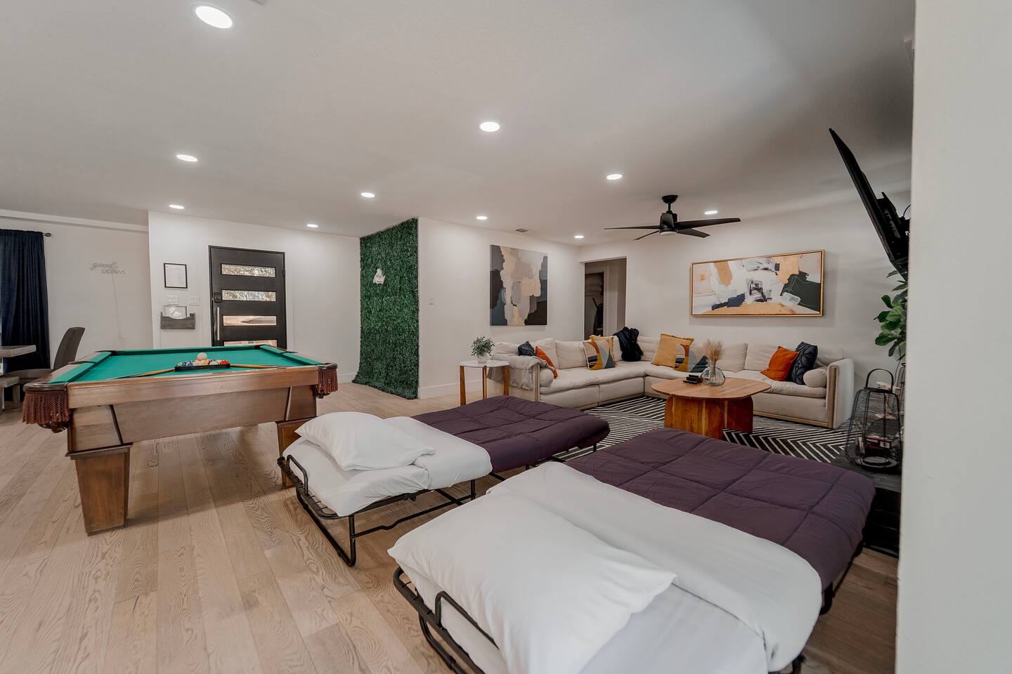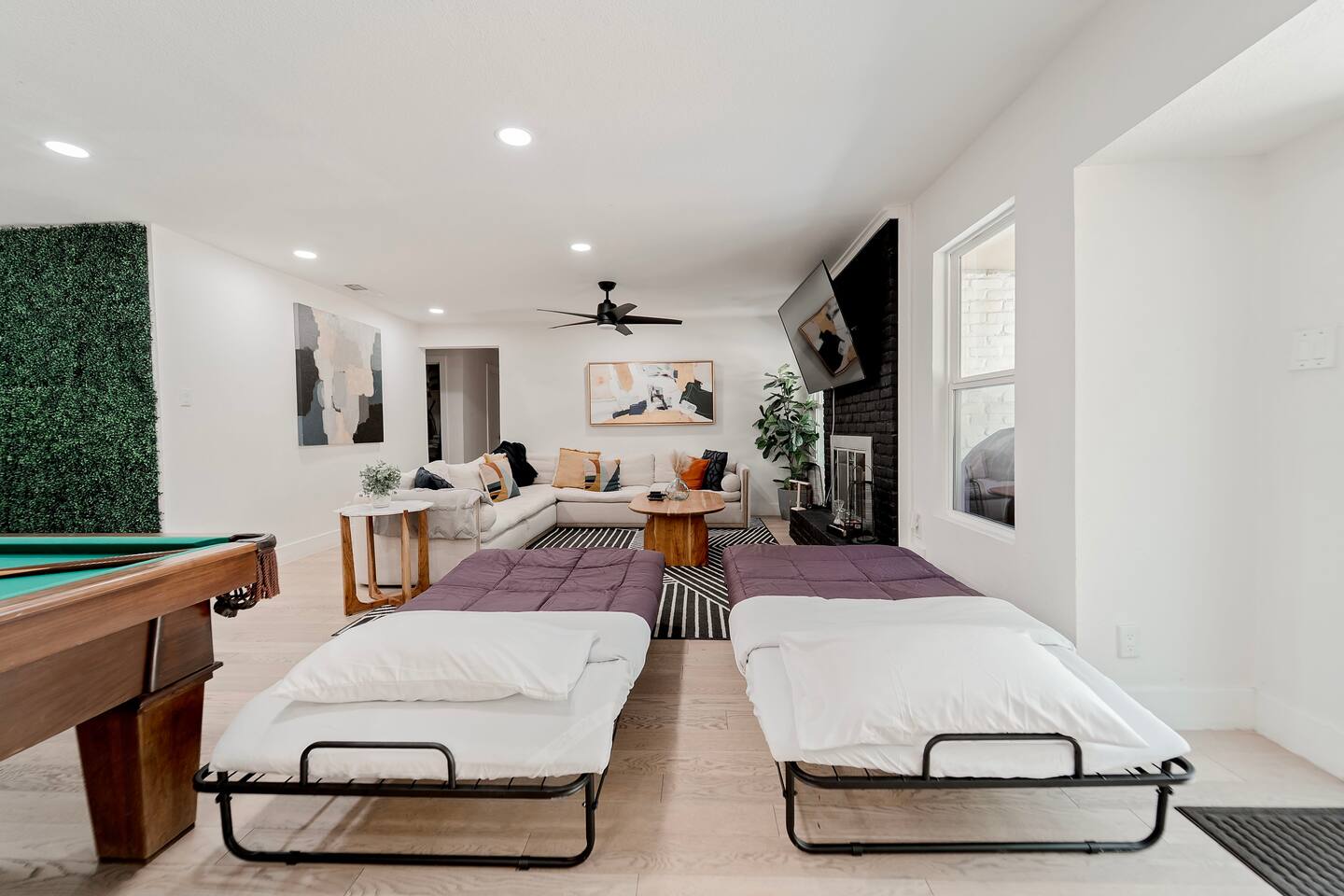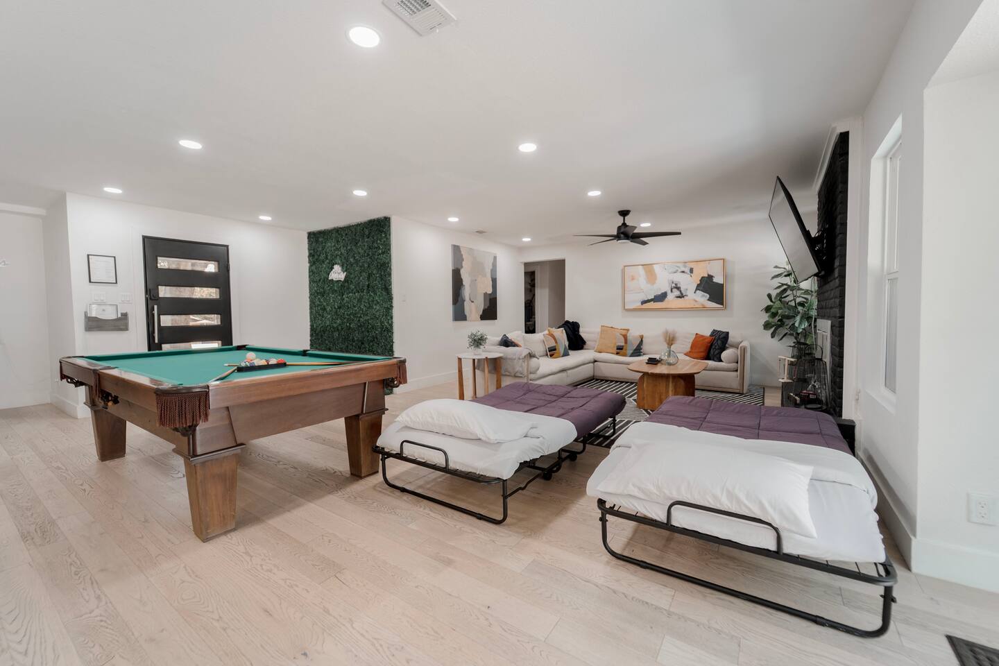 Welcome to this vibrant 4-bedroom, 3-bathroom home in East Austin—perfect for families, friends, or group getaways. With space for up to 10 guests, enjoy a fully equipped kitchen, arcade games, pool and ping pong tables, and a large TV. Step outside to relax in the hot tub, fire up the BBQ, or unwind by the outdoor fire pit under the Texas stars. Whether you're cooking, lounging, or playing, this home offers comfort, fun, and convenience just minutes from Austin’s top attractions.